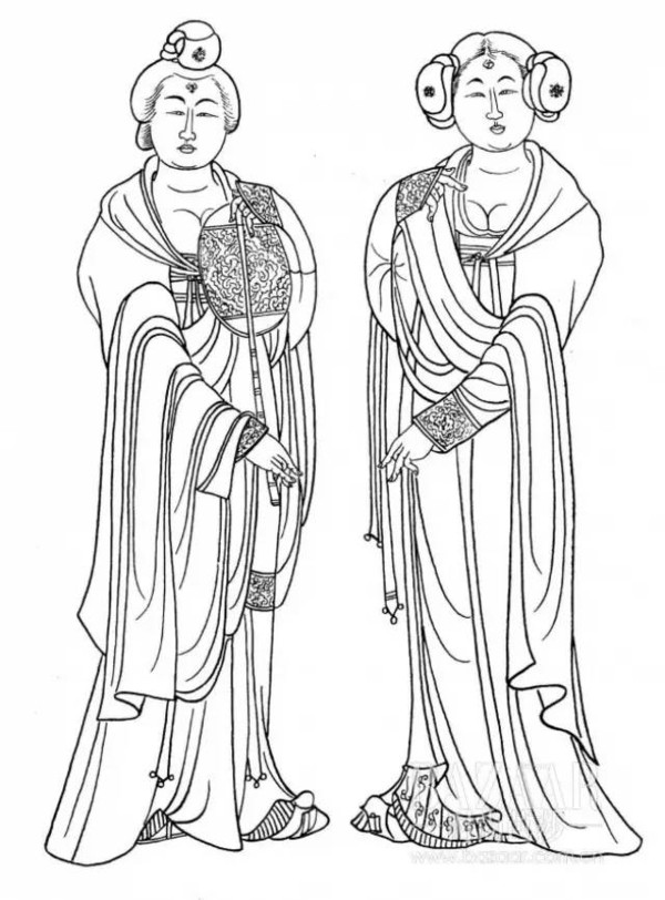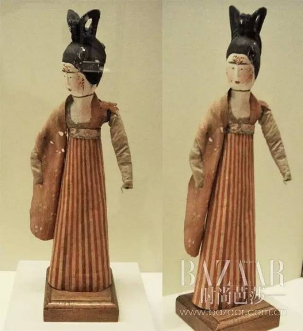 阿斯塔那出土唐初戴假髻(环髻),披披制的女子塑像到了唐高宗后期和武则天时代,上衣较之过去变长,服饰的整个轮廓显得非常苗条。不过武则天时代的一个现象是,女性衣饰的领口显得很低,那是一个女性最不吝于袒露胸线的时期。