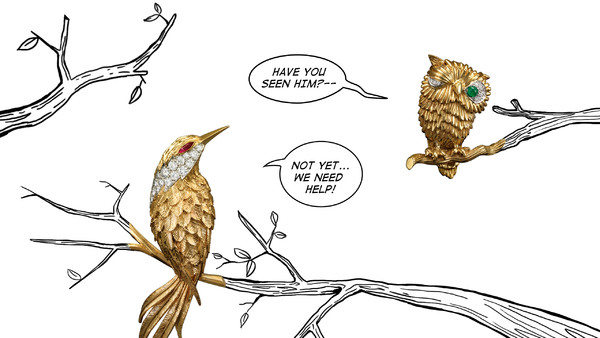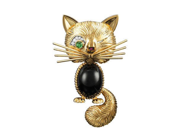 如今,梵克雅宝打算将所有小动物召唤回家,一起送往博物馆进行展出。他们陆续寻回了除狗狗之外的其它动物胸针,金树枝上的可爱小鸟,神情傲慢的小狮子,睁只眼闭只眼的猫头鹰……尽管他们保留了当年出售时的客户记录,但这只小狗胸针并没有被大量复刻,所以原版可能售出较早,尚难寻回。由于动物胸针的模具仍然在,复刻一只狗狗并非难事,但找回当年那只原版的狗狗,对这次展览来说意义非凡。