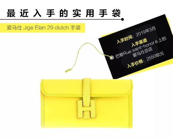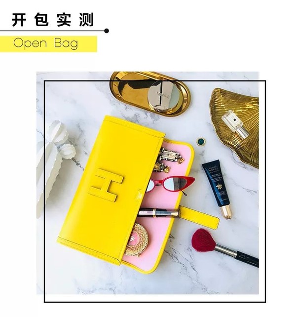 我喜欢它简约的H锁扣,设计简单低调,更喜欢它的颜色——耀眼的黄,并且我入手的这只最不一样,它的内里是樱花粉,这两种颜色不不仅在Jiege Elan里很罕见,也很特别,在我爱马仕的包包里也是为数不多的配色。