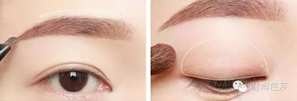 step1:用棕色眉笔画出眉毛的形态,然后用香槟色的眼影在眼窝的位置晕染开。
