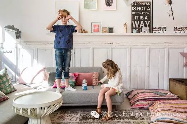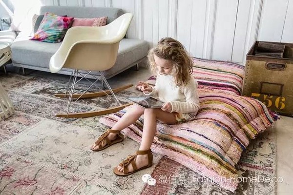 客厅的地上摆放着巨大的坐垫,让孩子们舒适的在上面阅读。