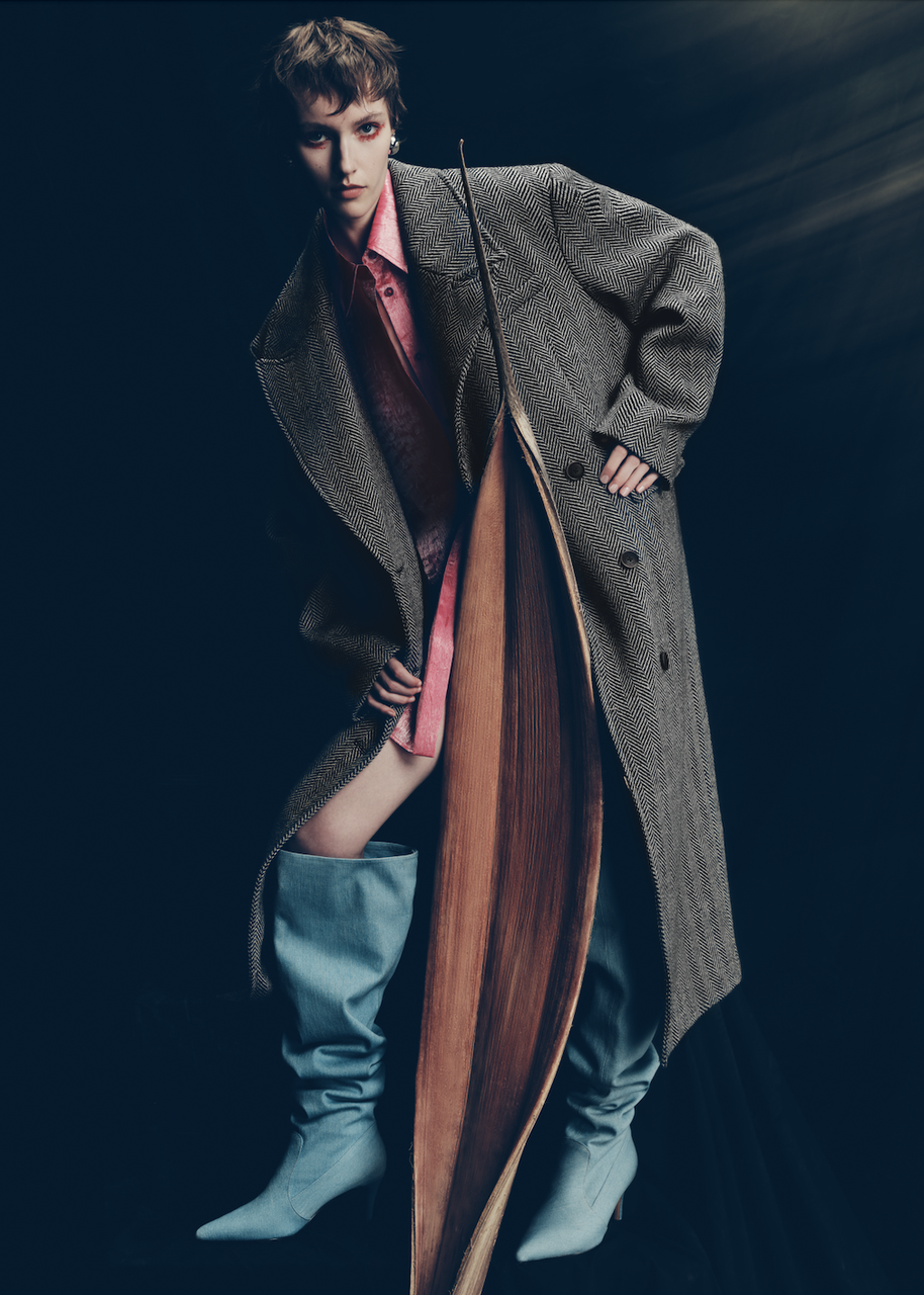 该系列以深秋原野上的干枯植物为灵感,将花朵、果实等表皮经历风吹日晒后的龟裂、褶皱等纹样转化为面料肌理,将不同灰度的彩色叠加在一起的复色灰配色通过阿苏特染工艺,并匹配简约实穿的廓形,为特立独行,大胆前卫的设计增添一丝原生态的狂野浪漫气息。