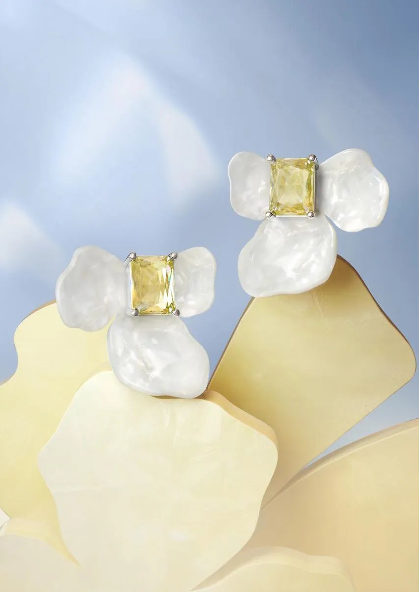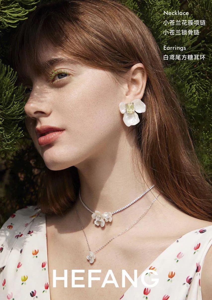 若花是春天给世界的情诗,那「白鸢尾方糖耳环」便是HEFANG给女孩们的春日告白。花瓣创新采用以自然植物花朵为原材料制造的环保板材制成,经由匠人八道工序的打磨抛光,每一片花瓣都呈现出独一无二的纹理与轻盈通透的高级质感,还原日光和水影映衬在花瓣上的粼粼波光。品牌标志性的淡黄色方糖石传递温暖治愈的力量,化作花蕊点缀于形态舒展的花瓣中间,花瓣的可拆卸设计满足多种佩戴场景需要。