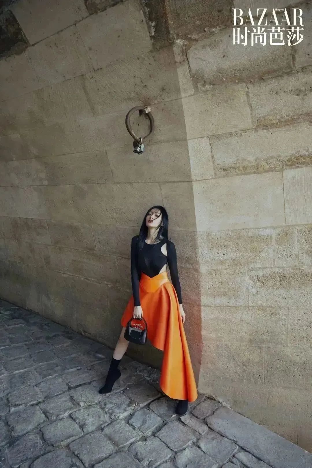 在城市里找寻生活图景,迷恋建筑所雕刻的符号意象。对色彩的感知,线条的创造,让日常丰满,随时起范儿。敢爱敢恨,骨子里透着不羁个性,就是张天爱的“范儿”。黑色嵌花针织紧身衣、橘色皮革不对称垂褶半裙、The Shard针织靴及The Jewelled Hobo迷你指环包均来自Alexander McQueen 2023春夏女装系列。街头即秀场,承载张天爱日常之美的多元表达。黑色嵌花针织紧身衣,完美呈现形体之美,诠释时尚张力。橘色皮革不对称垂褶半裙,力量感与未来感交织,展示着她“从不妥协”的处世哲学。