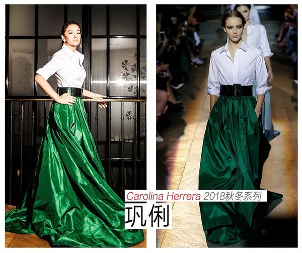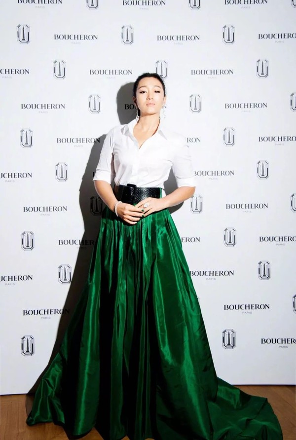 本周巩俐再秀经典的白衬衫造型,但这次祖母绿的束腰大长裙代替了黑色鱼尾裙,更是气场大开。在#十年挑战#的风潮下,说什么93年经典已成历史的,时间带给巩皇的强大“攻”力,可不比懵懂的年少更加珍贵!