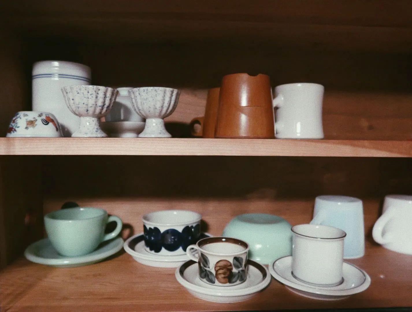 小杯子是芬兰陶瓷制作著名品牌 Arabia 出品。芬兰著名设计师Ulla Procopé(1921-1988)作品之手绘蓝色海葵中古杯多件套组50-60年代经典版(已停产)。绿色杯子是美国的Fire King,就是花样年华里梁朝伟和张曼玉约会时用的杯子。