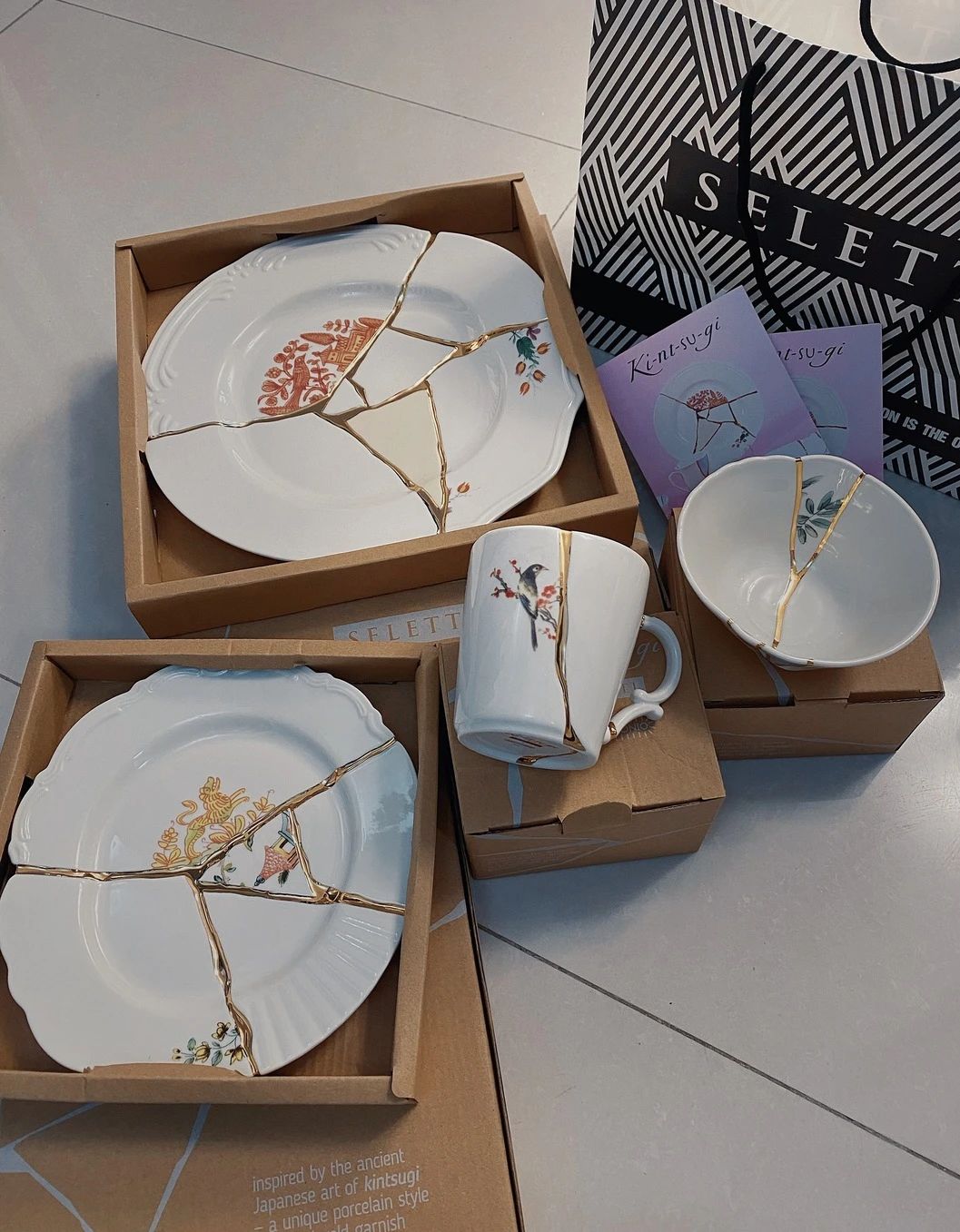 这一套来自SELETTI的Kintsugi 24K金缮系列的碗碟我特别喜欢,灵感源自传承千年的金缮修复工艺,金色的笔触修复拼接的美感。