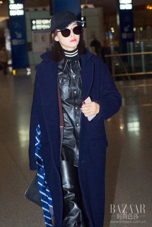 江疏影的漆皮夹克剪裁别致,宽大的衣袖为中性款式增添了女性魅力。皮革的质感与光泽打造出全黑造型中的层次感。