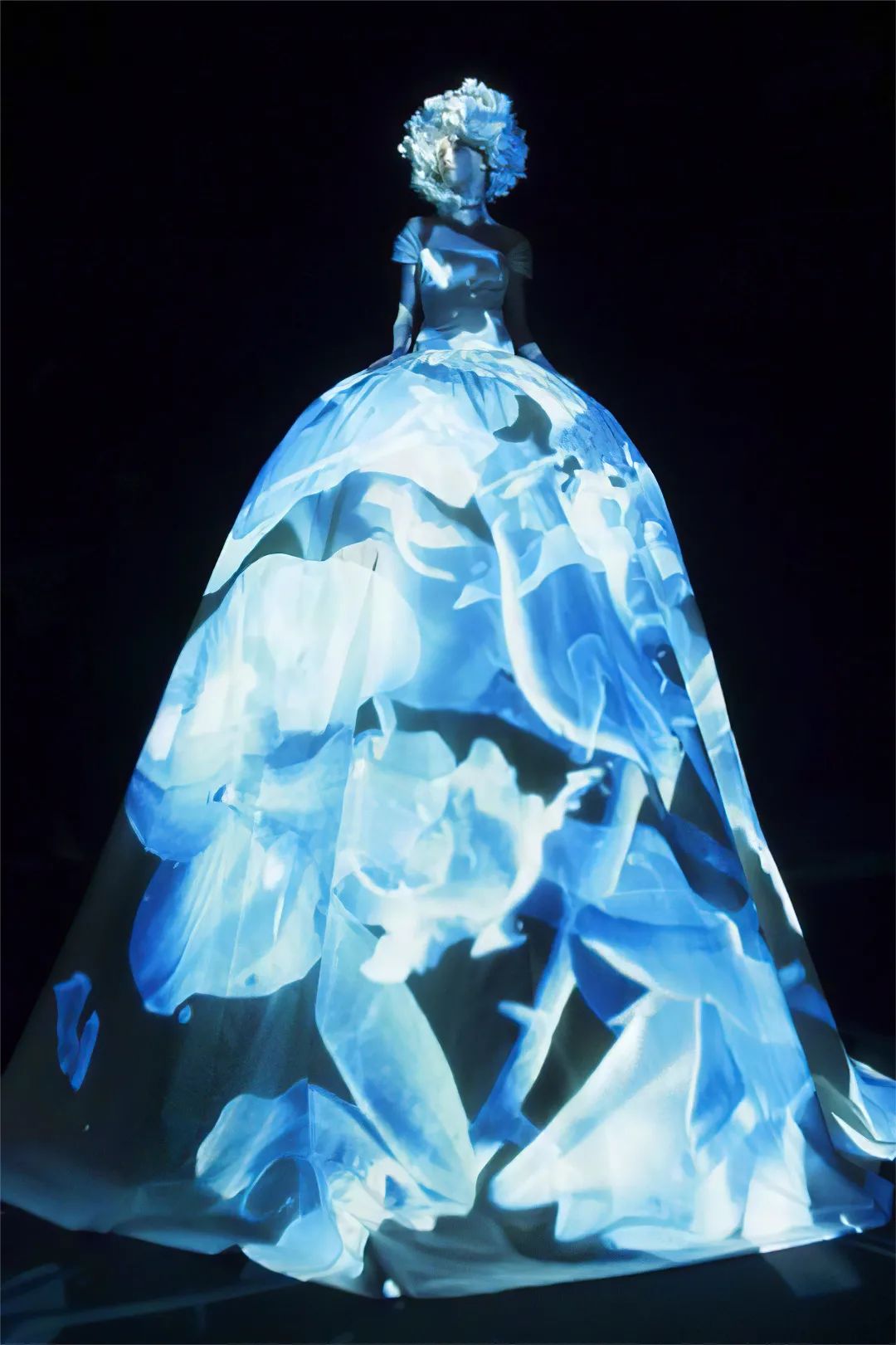 这是寂静之下的幻变,时装开始被数码技术和灯光着色,灵动的花瓣在裙身上映入影像,观者遁入空灵的意境。