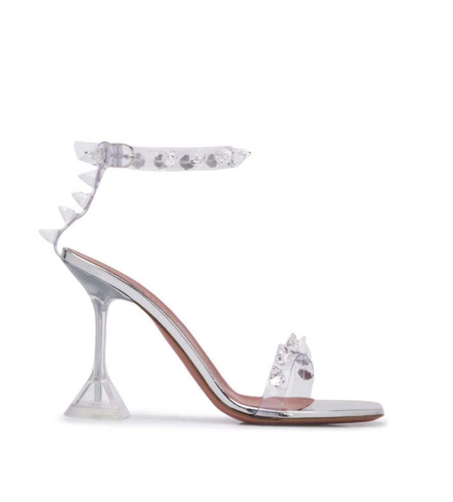 而她们脚上仙气十足的透明跟鞋就是来自意大利的设计师品牌Amina Muaddi,以金字塔三角型鞋跟获得了许多明星和博主的追随。