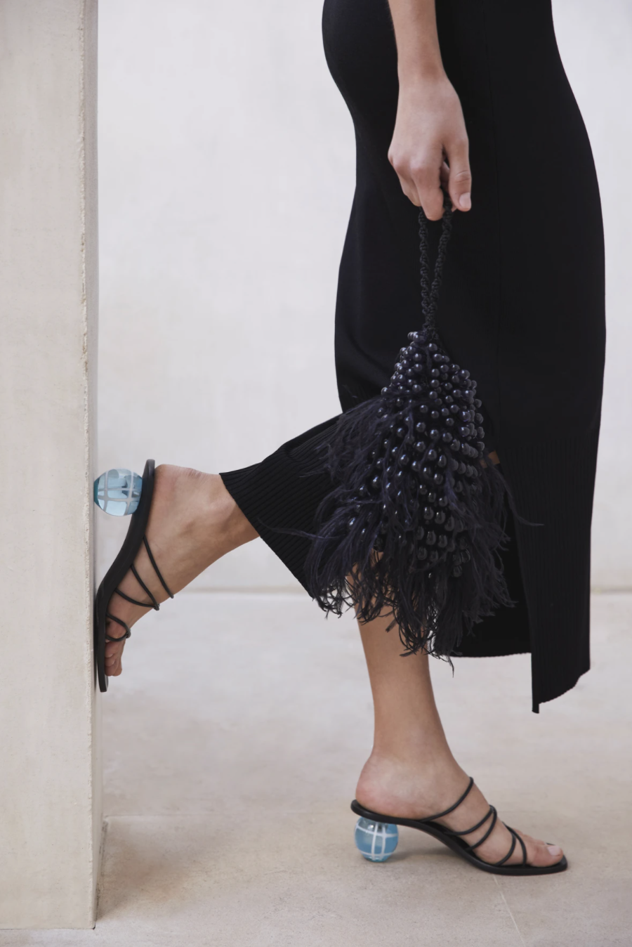 Cassie Sandal的灵感就来自于波西塔诺的吹制玻璃,球形鞋跟上的“经纬网”采用了手绘的方法去诠释,这也说明了每一双手绘高跟鞋都是独一无二的。