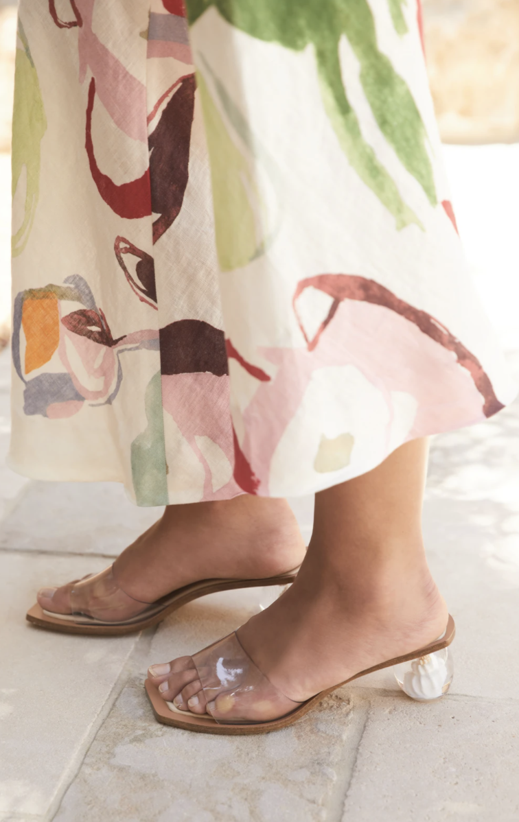 Tao Shell Sandal更是在纯透明的亚克力圆形鞋跟里添加了贝壳,这也就为Cult Gaia的女孩实现了可穿戴的艺术。