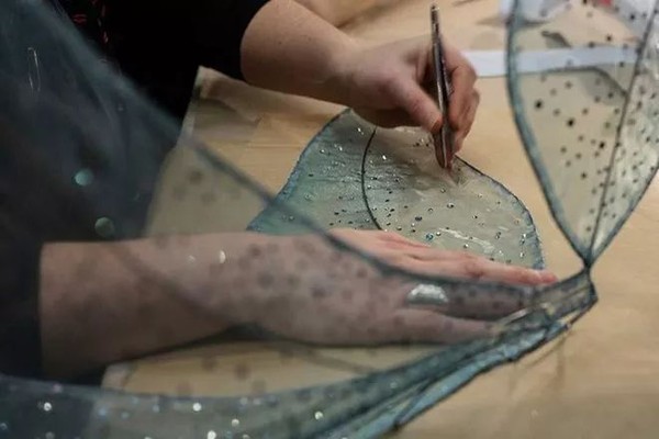 “你看到的那些颜色是染上去的,比如舞裙底部的玫瑰粉色薄纱,而且常常从已有的色彩方案中选择颜色,重新上色——不过,正是因为有了光,才能为这些设计增添一种超脱现实的梦幻感觉。”。
