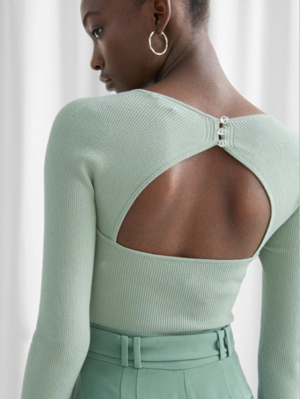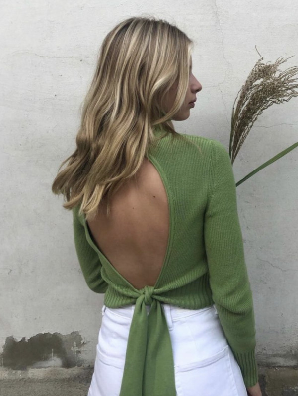 小众品牌Attire也推出了在肩部挖空的毛衣设计,不过它家可不只开在肩膀处,背后也别有一番风景,绑结在背后可以根据喜好调节腰部松紧,为了穿出圈可得使点小心机了!