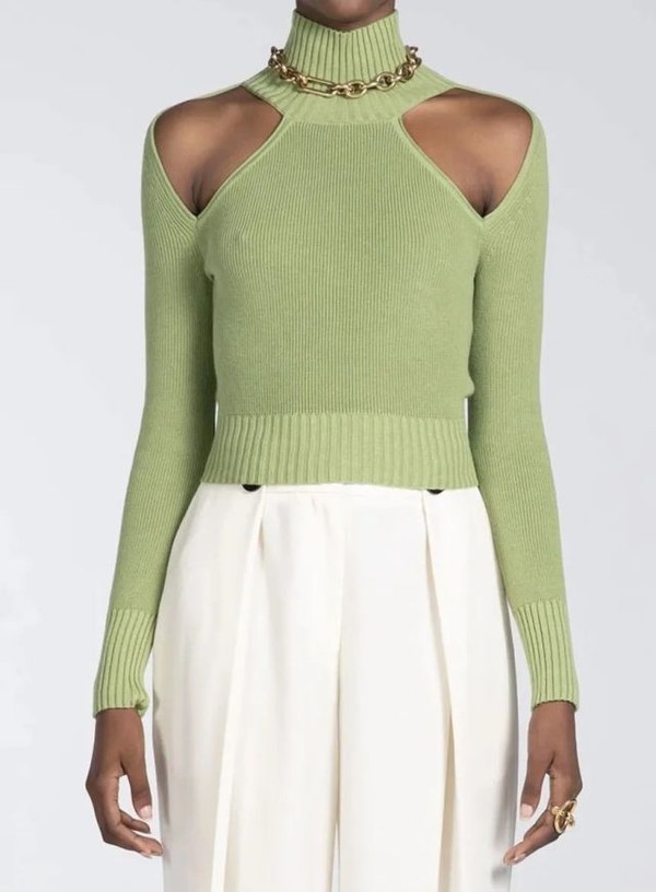 在INS上最近风很大的意大利纯手工制作的品牌TL 180也没有错过这个势头,和时装博主Resee Blutstein合作了一款绿色格纹肩部镂空针织衫上身同样很Drama,融合最火的“袖套”,配上抢眼的撞色,酷得完全不一样!