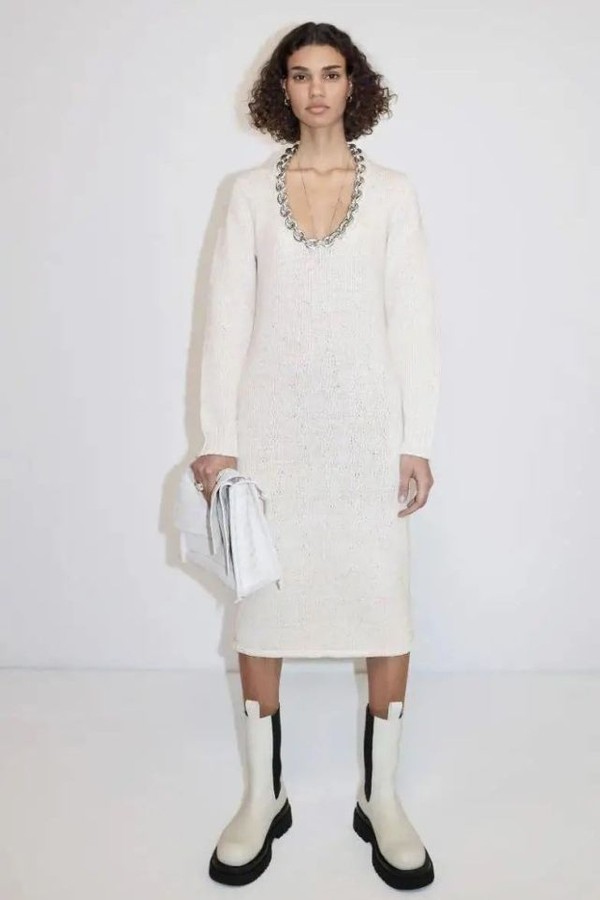 这款同样推出了一条长裙毛衣,贴身的设计强调了女性的身材曲线,但是加上粗链条设计又弱化了针织衣物的柔和感,强势又微妙。