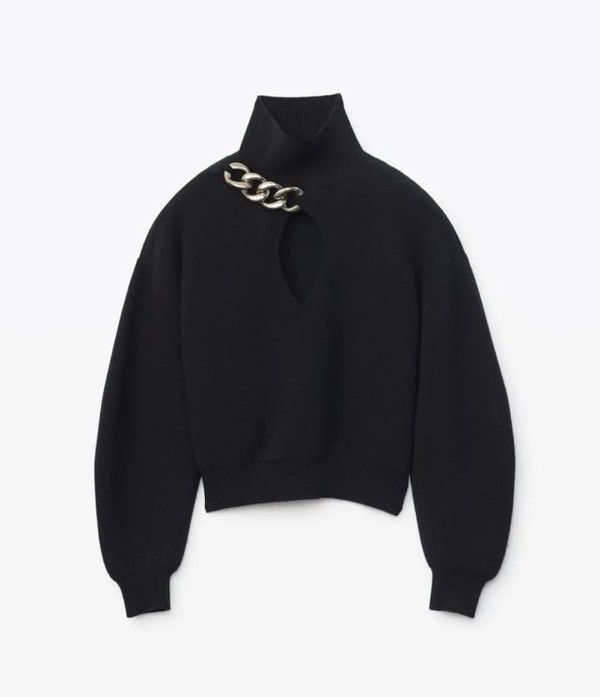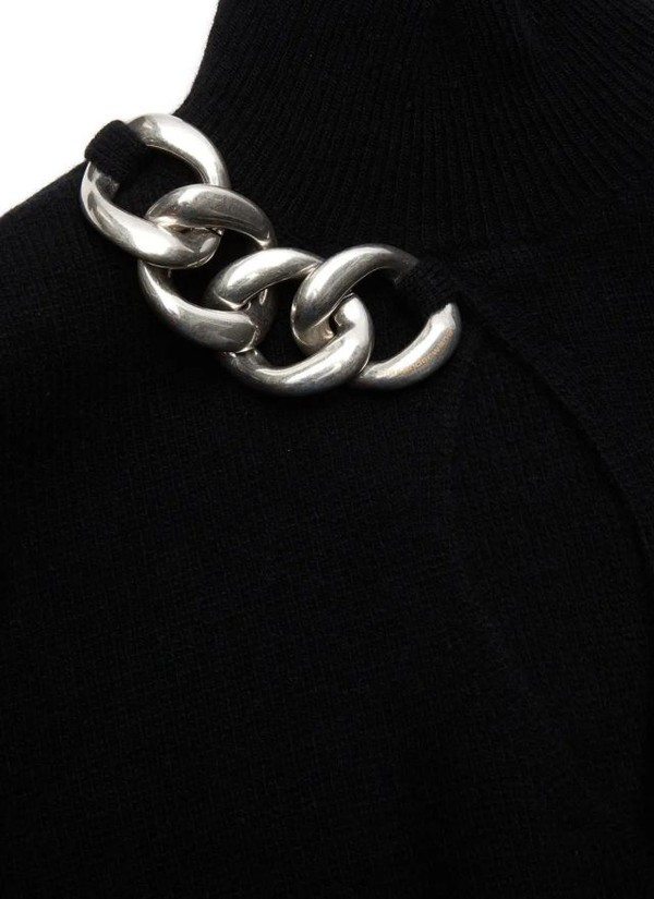 alexanderwang新款高领链条针织镂空毛衣也可谓是在领口上下足了功夫,高领短款的板型结合胸口镂空设计,配以肩部单侧的链条设计,吸睛度Max。