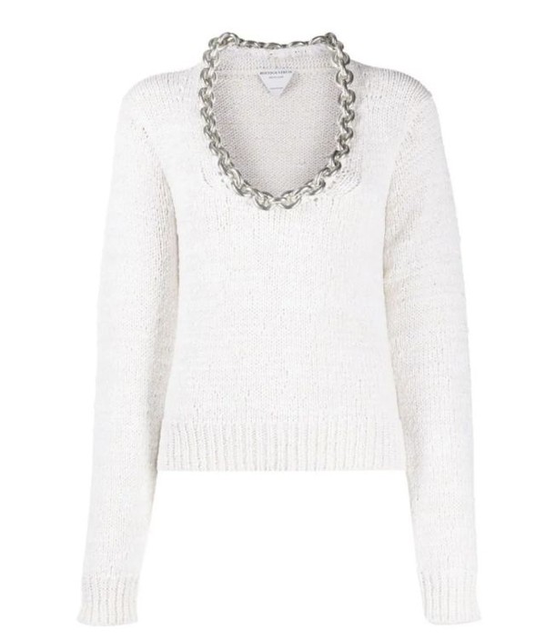 今年金属风毛衣也火到大街小巷,多加一条链条设计,连佩戴Choker的力气都帮你省了!别只盯着Bottega Veneta的包包了,今年Bottega Veneta的搭链针织毛衣也很OK,将充满力量感的金属链条融入领口,细节里微妙的不同,处处隐匿着大女人的心计。