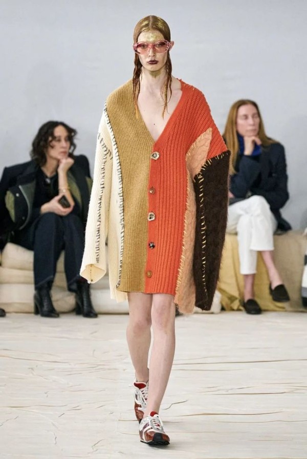 秋冬就该玩儿点不一样的,拼接毛衣绝对是酷女孩衣橱里最不能缺少的一件,Marni 2020秋冬系列一开始便大玩拼接+解构,腰部中间以几道缝针连接起来,横竖错综的条纹巧妙融合,街头意味十足。