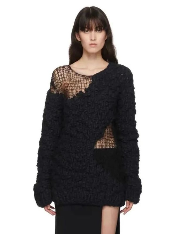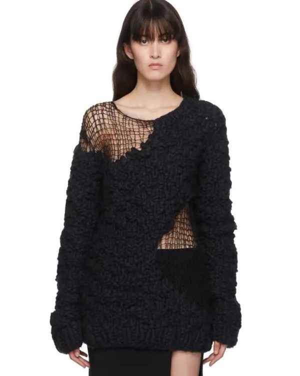Ann Demeulemeester的这一款纱线拼接毛衣也十分惊艳,肩部和腰部以细纱线镂空,与编织毛衣形成强烈对比,带着一丝危险哥特的气息。