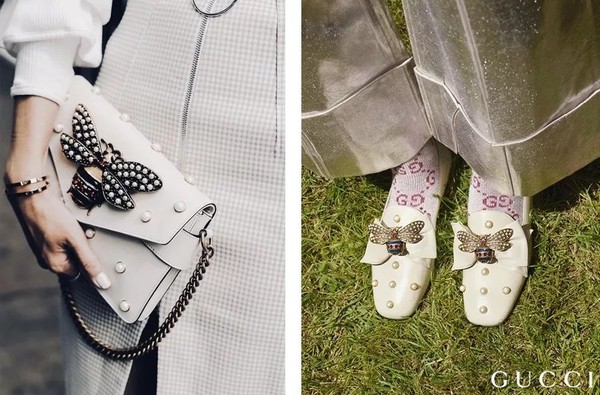 刚刚接手Gucci的Michele 在2015 秋冬系列充分表达的了品牌的尊敬,在保留Gucci原始配色与款式的同时,悄悄把他的蜜蜂放在了经典包袋上。而2016年以后他则更为充分的表达自我,蜜蜂图案的样式发生了改变,也逐一经过多种变形,有了更为丰富俏皮的表达。
