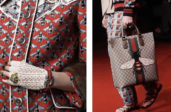 Gucci也是近年来十分喜爱使用蜜蜂元素的品牌之一。Alessandro Michele本身是个生物学爱好者,蜜蜂、蛇、和老虎都是他赋予Gucci的经典符号。