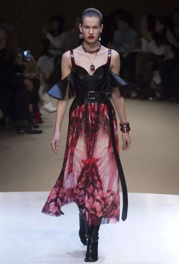 Alexander McQueen的2018年秋冬系列,蝴蝶再次成为该系列的主要灵感元素出现在秀台上,与之前不同,鲜艳浓烈的蝴蝶印花与强势的肩部廓形相结合,呈现出一种极端的浪漫主义风格。