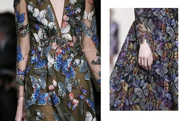 跟Alexander McQueen关注蝴蝶图案本身不同,同样爱用蝴蝶元素的Valentino则将重点放在蝴蝶的色彩和造型上。