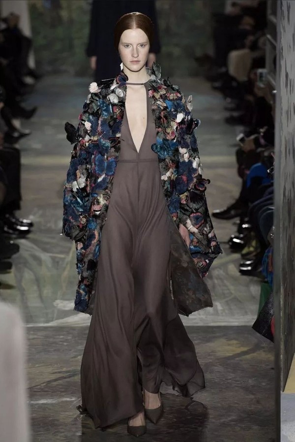 Valentino 在2014年春夏系列高定曾经别出心裁的用羽毛做成的上千只蝴蝶缝制在斗篷上,这件蝴蝶斗篷和Alexander McQueen惊鸿一瞥的红蝴蝶look完全不同,羽毛蝴蝶随着模特的动作轻盈摇摆,宛若梦幻。模特化身林中仙子,让人记忆犹新。