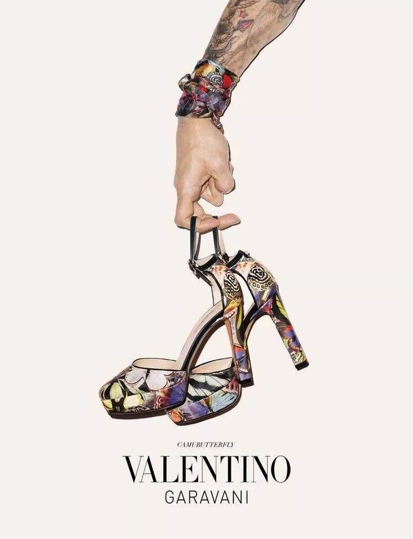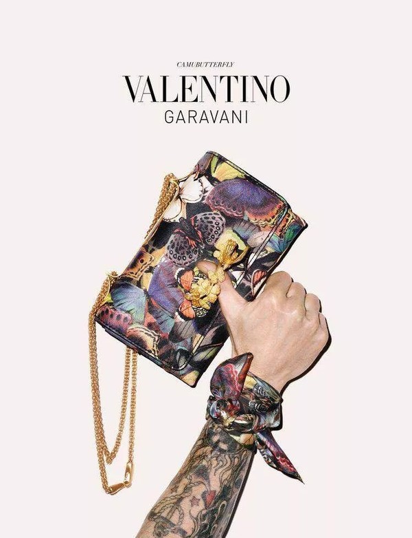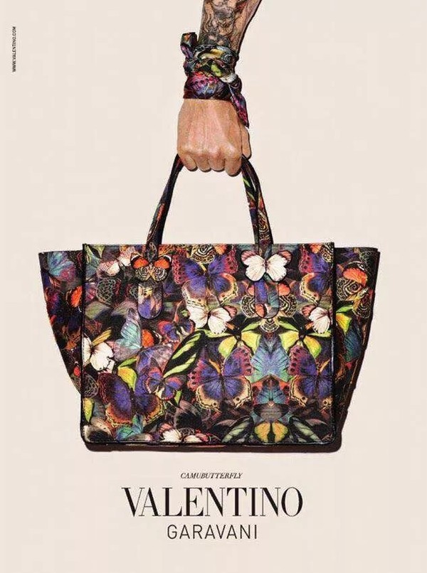 Valentino的蝴蝶亦不是只可远观的艺术品,很快在2014年秋冬,蝴蝶又出现在了Valentino成衣系列的皮包和鞋履系列上。这一季的单品被设计师重新定义为:Camubutterfly (隐匿的蝴蝶)。