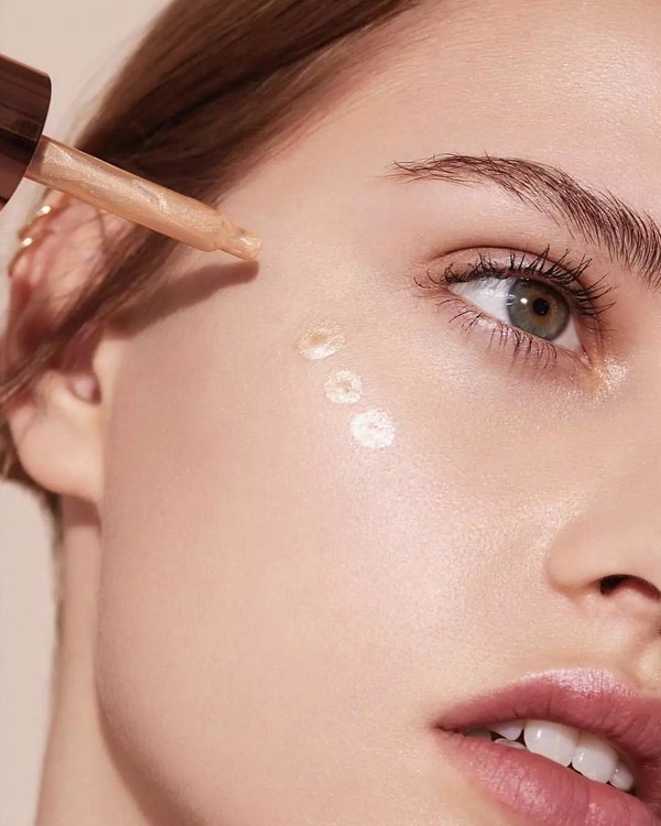 珠光感强烈的高光液虽然打在脸上很美,但是开始出油后就是噩梦啊!所以为了避免这个问题,我们可以用浅色的保湿粉底液代替高光,涂抹在额头、T区、眼下等需要提亮的部位,替代高光,让整个妆容清爽。