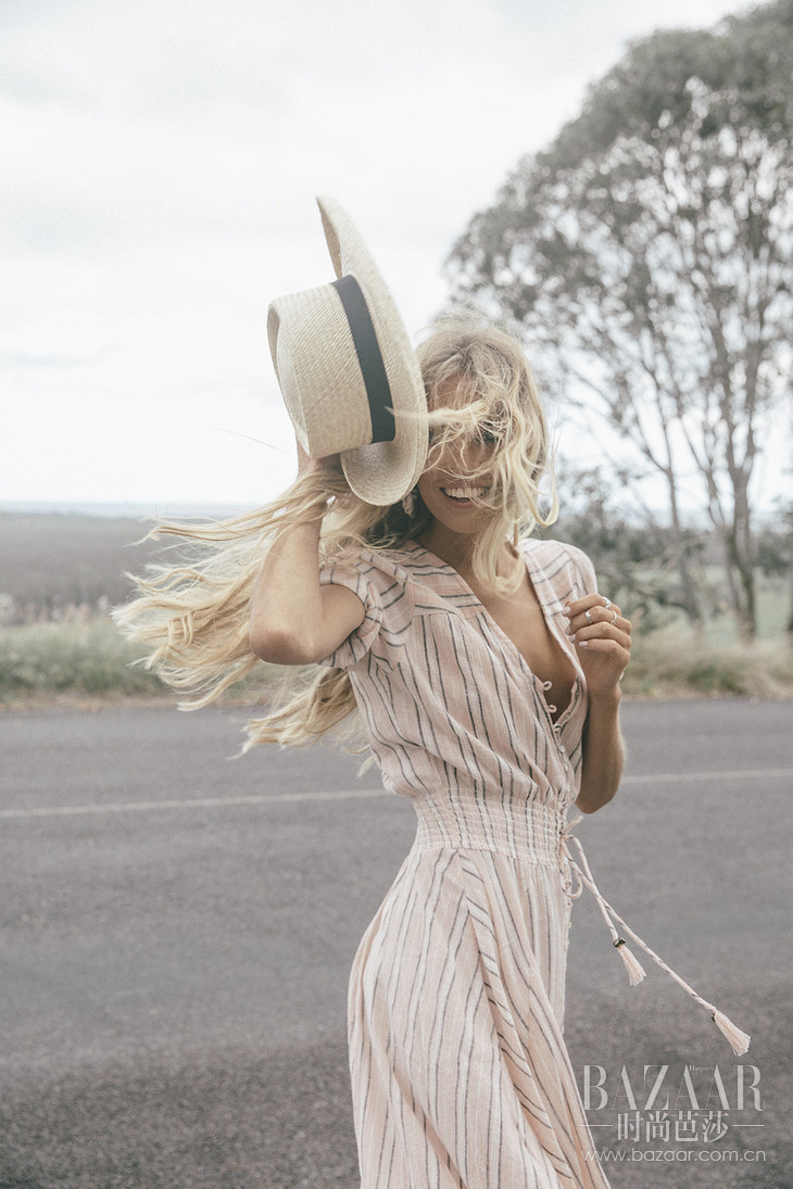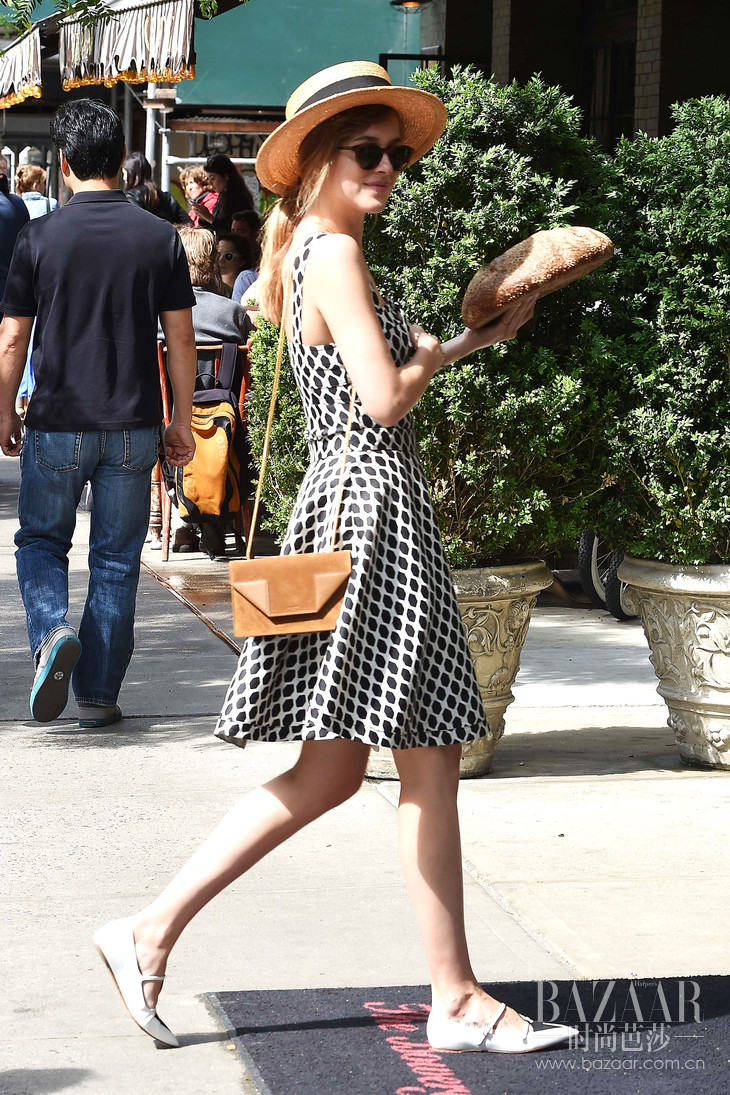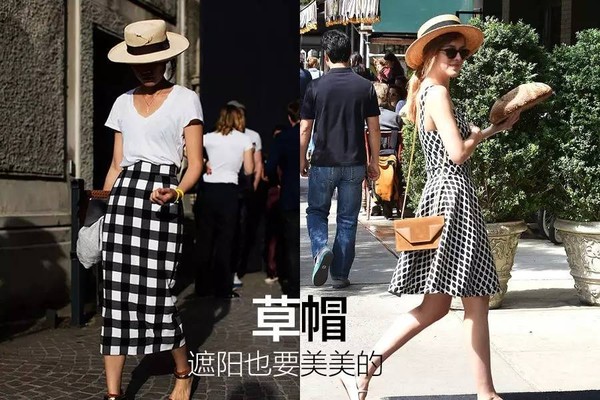 条纹连身裙搭配短靴,呈现出酷酷的街头风,用草帽搭出了休闲街头的随意感。