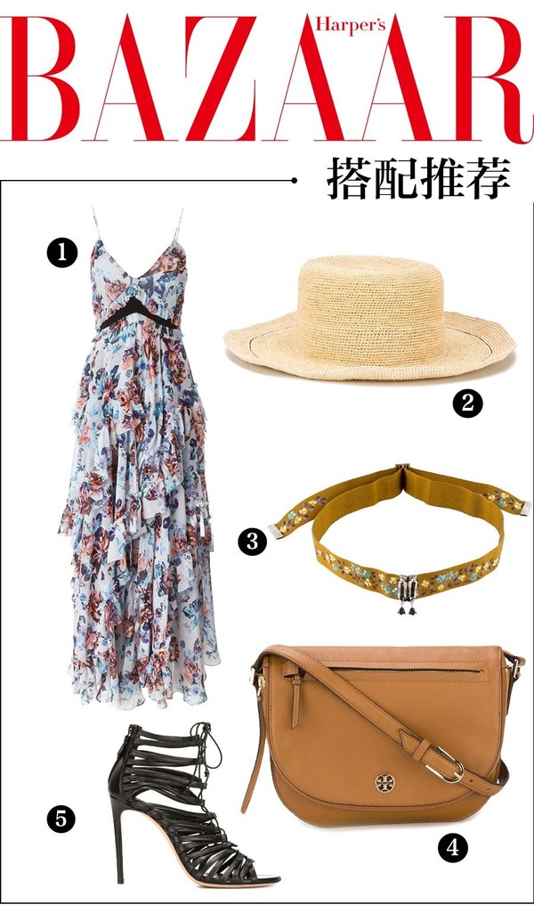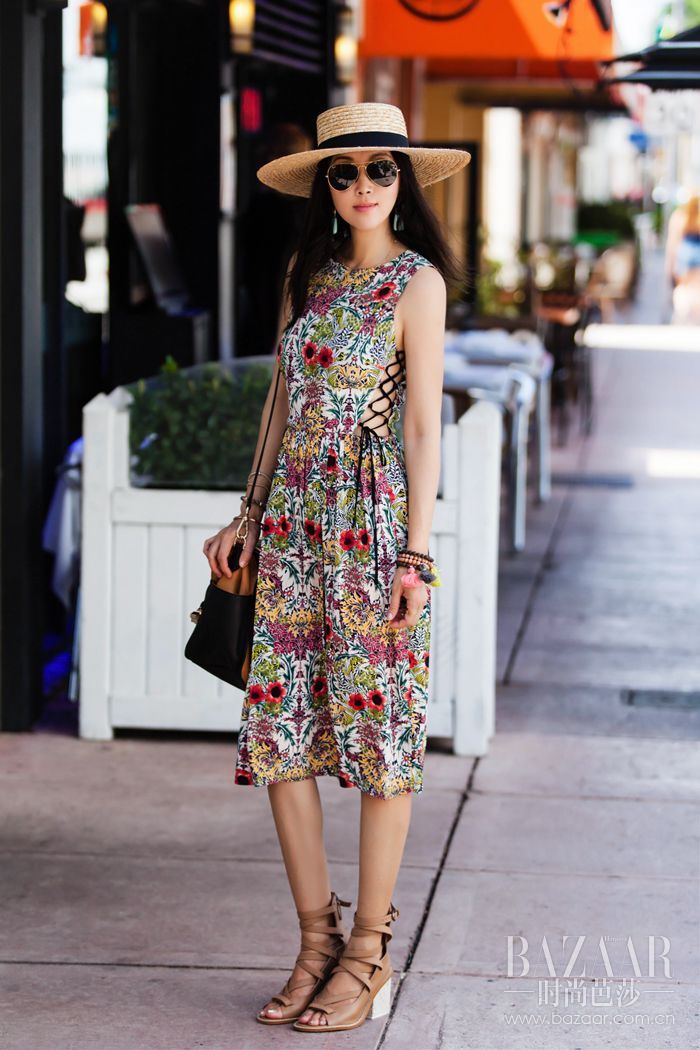 碎花连身裙,搭配罗马粗跟鞋,女人味十足的同时看起来复古又文艺,帽檐越大越能够显脸小。