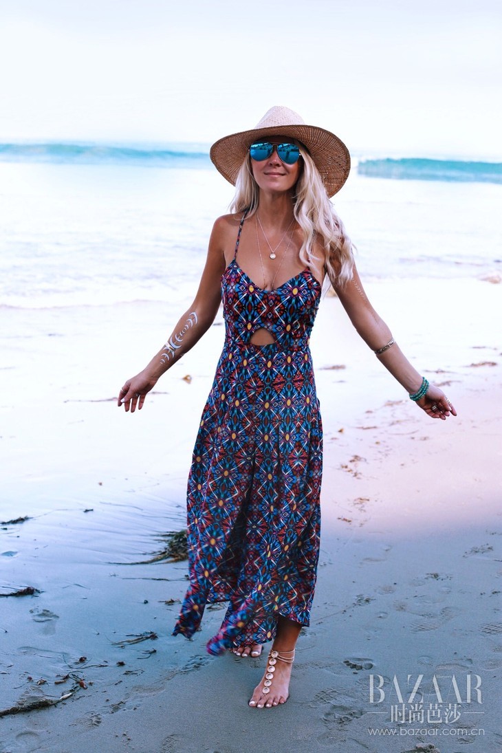 Kendall这身透视裙装看起来神秘又飘逸,配上草帽随意而潇洒。