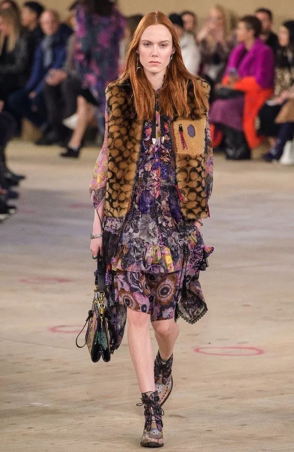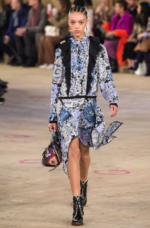 花朵繁复的印花连身裙将生命力和希望注入秋冬,袖口饰拉链的皮质风衣为整体增添了率性和硬朗。