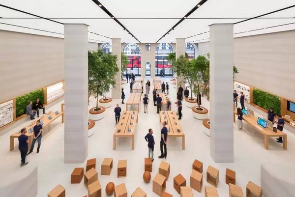 新的苹果旗舰店内部空间是一个7.2米的双高大厅,形成一个像“城市广场”一样的灵活和欢迎的空间,该设计增强了街道与室内的透明度,并采用自然光线,极大地改善了两层之间的视觉联系