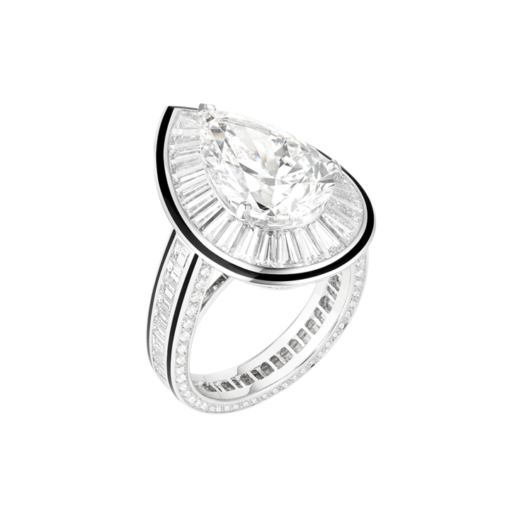 黑色边缘设计充分展现了简约线条所蕴含的无限张力:5.27克拉的梨形切割钻石,搭配颇具线条感的黑色轮廓,散发触动人心的现代艺术气息。正如滚边可以突出时装轮廓一样,这件作品是Boucheron宝诗龙经典高级珠宝的标志之作。