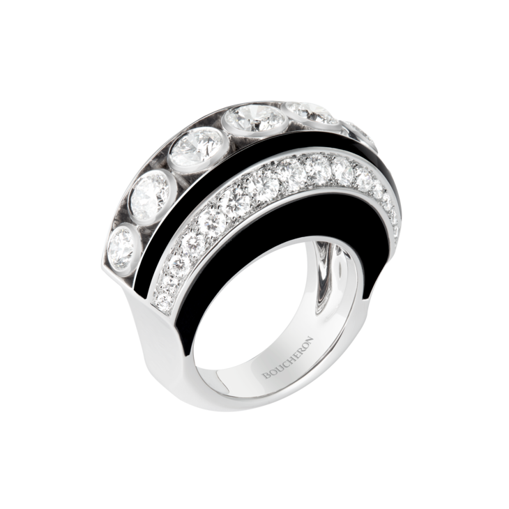 为与当代格调相呼应,创意总监Claire Choisne选择放大时装精神和“咆哮的二十年代”(Roaring Twenties)的对立,聚焦于女性和男性气质、纯粹而又丰富的线条,以及在一抹色彩衬托下更显强烈的黑白对比。Boucheron宝诗龙将精湛的珠宝工艺运用于富有装饰艺术风格的飘逸感项链和缎带手镯中,化身为极具现代感的多面穿搭珠宝。