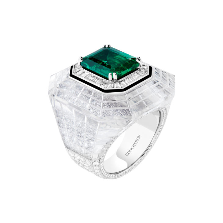 自信与大胆是胜利者的标志。这枚戒指的设计突破性别限制,沿袭品牌所珍视的建筑之美,以旺多姆广场俯瞰图为灵感,重塑标志性八角形轮廓与鹅卵石路 面。一颗引人注目的4.43克拉木佐祖母绿镶嵌于中央,四周环绕长方形钻石并以黑漆点缀勾勒,宛若将巴黎盾徽点缀于指间。