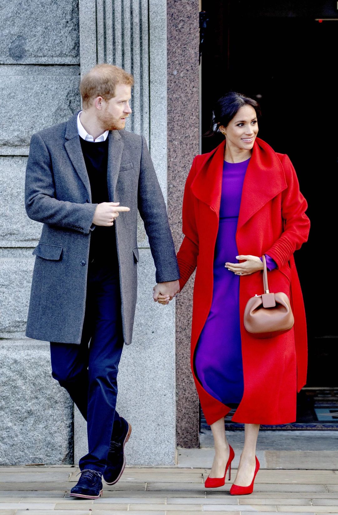 梅根这次出访竟然带了很多旧衣,比如在伦敦出席名为the One Young World summit 开幕式活动时,她穿的紫色连衣裙就是之前怀孕时穿过的一件,只不过当时还加了件红色大衣。