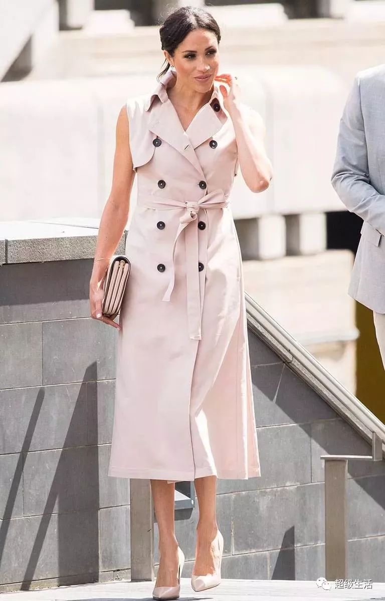 之前有网友评论王妃的衣服是不是穿完一件就扔掉。事实证明并非如此,这件无袖风衣裙生宝宝前穿过,如今生完孩子换条腰带换个系法,腰身依旧。