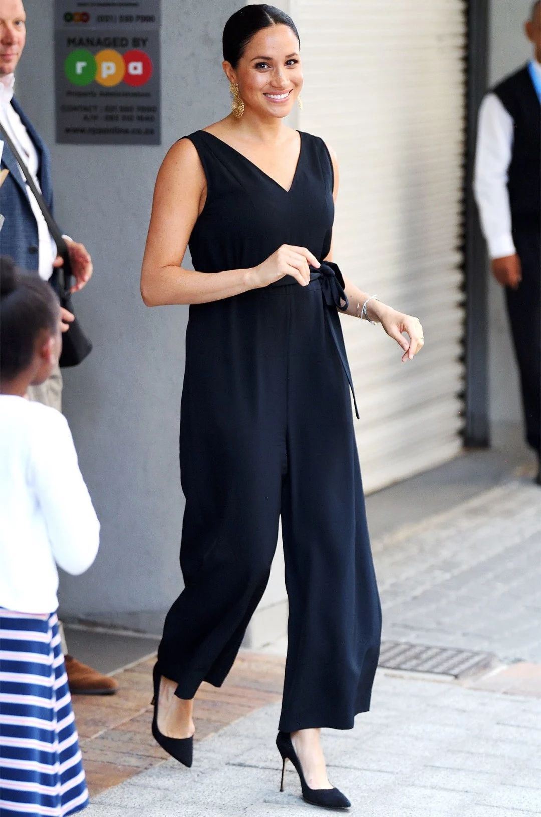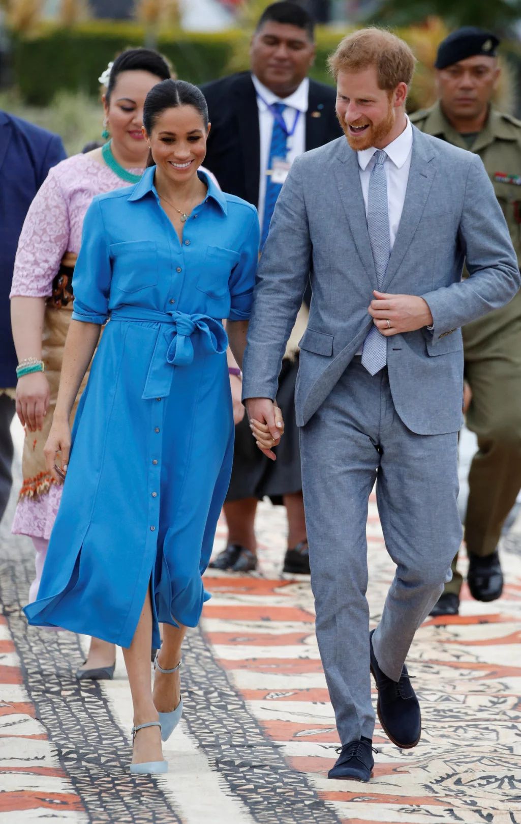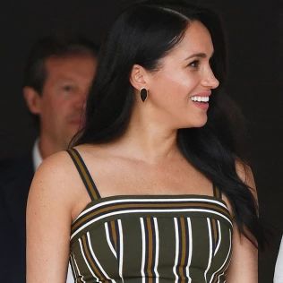 梅根去年出访穿过的Martin Grant条纹吊带裙,当时戴了花环,光脚走在沙滩上,很是应景,今年在城市中走就穿了常规的高跟鞋。