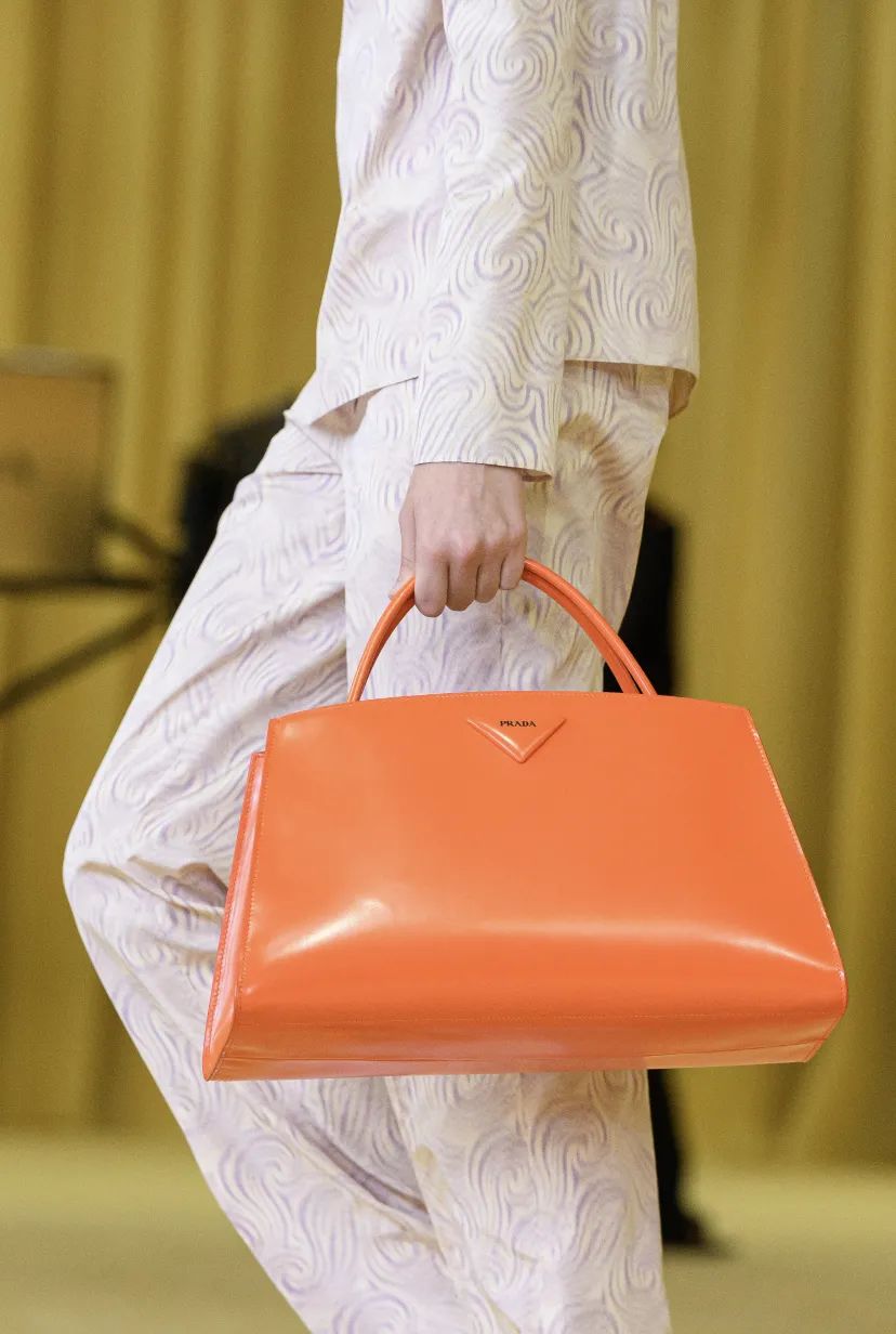 化繁为简的纯色设计和随处可见的标志性三角Logo都能轻松get,世界与美学、技术的相遇,让TOTE BAG有着完美的流线型轮廓,搭配漆皮材质,简约与质感相融,非常高级,鲜艳橘色给人一丝年轻又轻快的美感。
