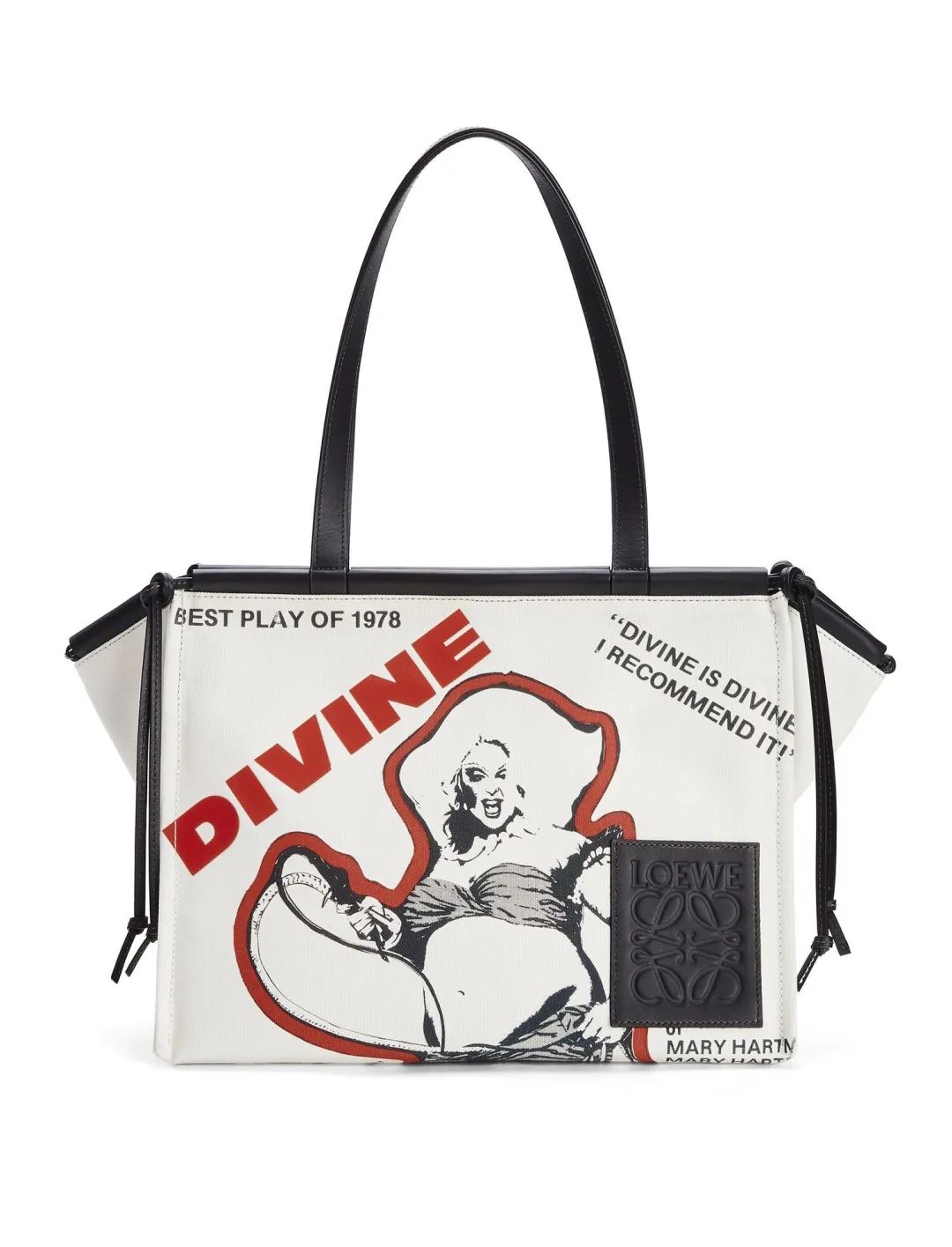 以Cushion Tote为原型,LOEWE✖️Divine合作系列的帆布手袋,印有1978年理查德·伯恩斯坦(Richard Bernstein)在《霓虹女人》中的图案,是Divine限量版系列的一部分,向这位超越生活的美国演员致敬,非常有纪念意义。