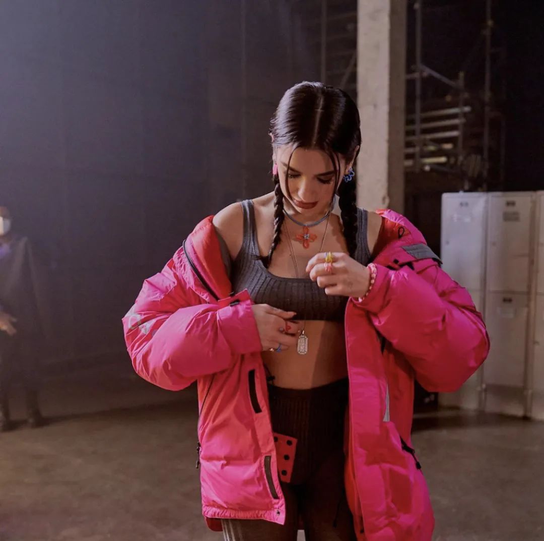 最近在紧急拍摄新专辑MV的歌手Dua Lipa,即使在MV中穿得再清凉,一离开镜头还是得赶紧套上羽绒服取暖。