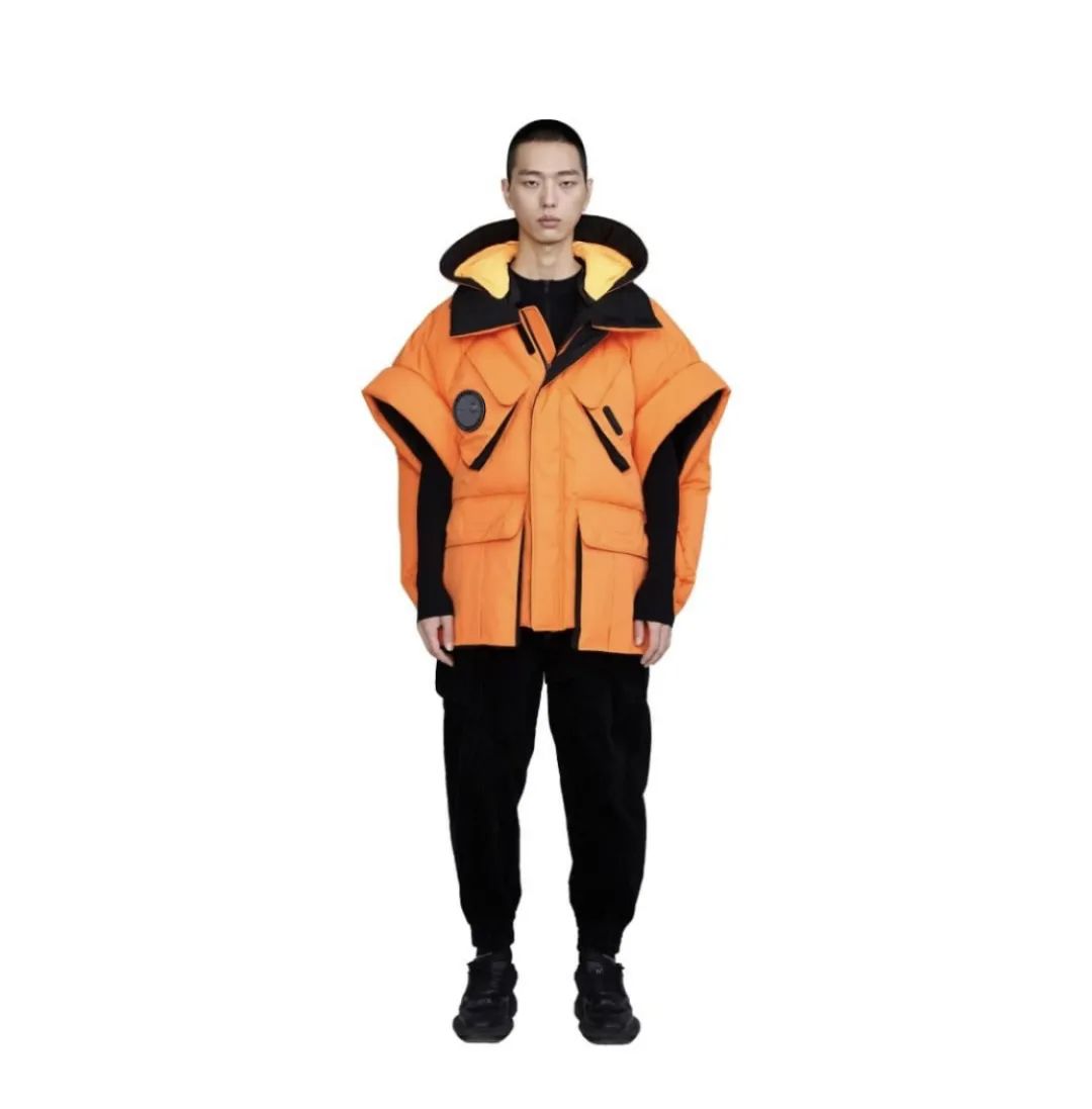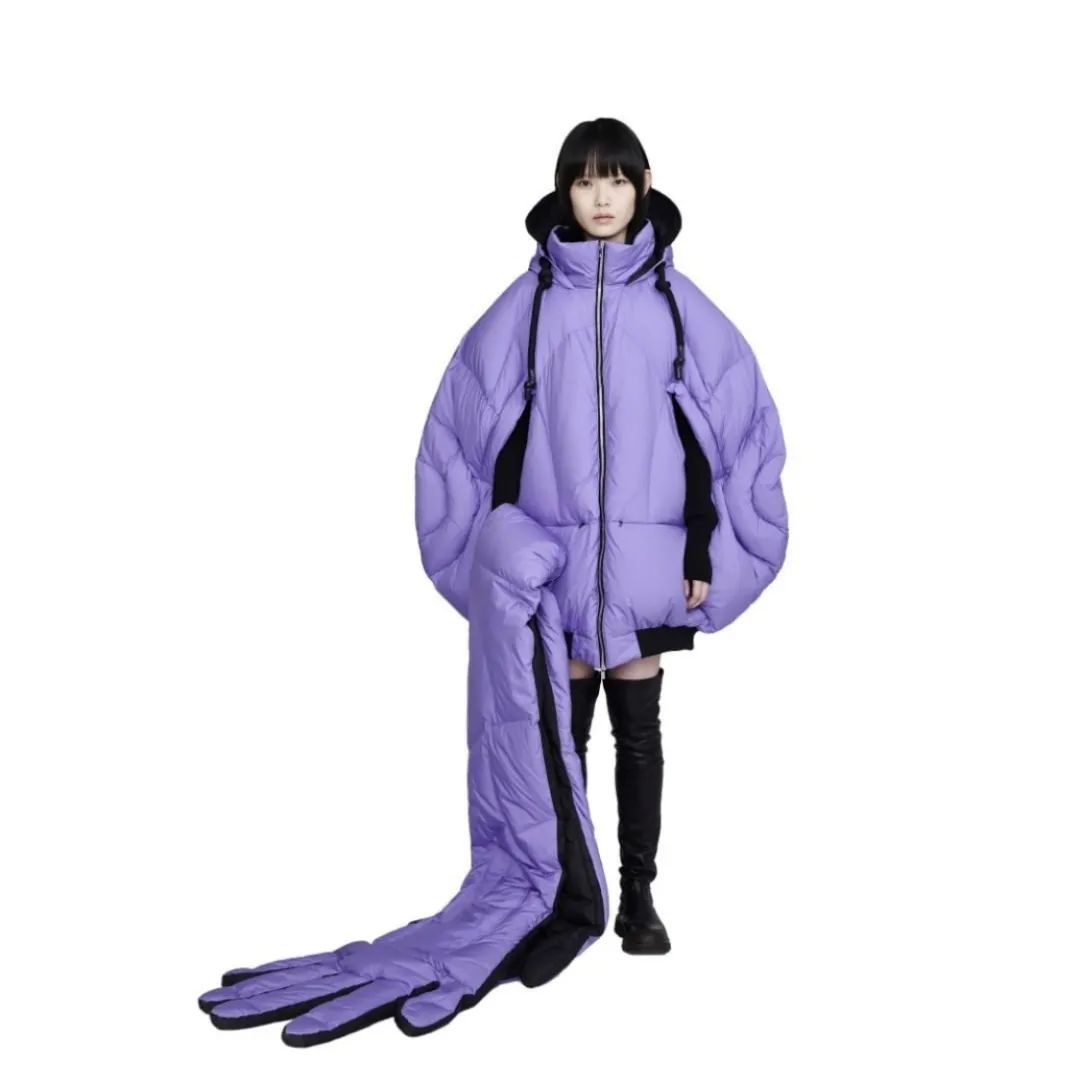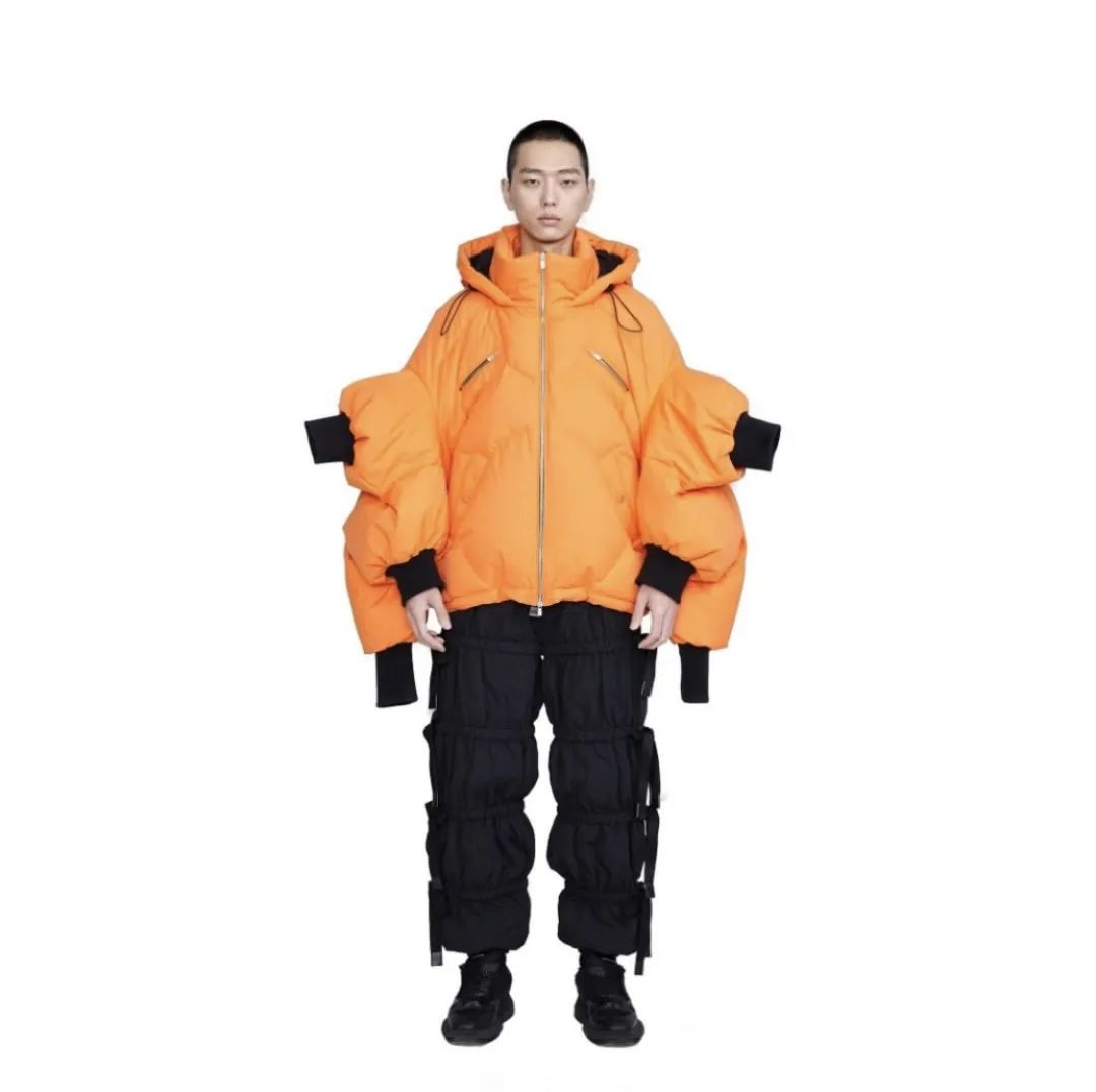 这款设计更加独特和怪诞,三处伸向不同方向的袖口设计不仅可以同时解锁多种穿法,更是让原本呆板无趣的羽绒服变得时髦得不行。