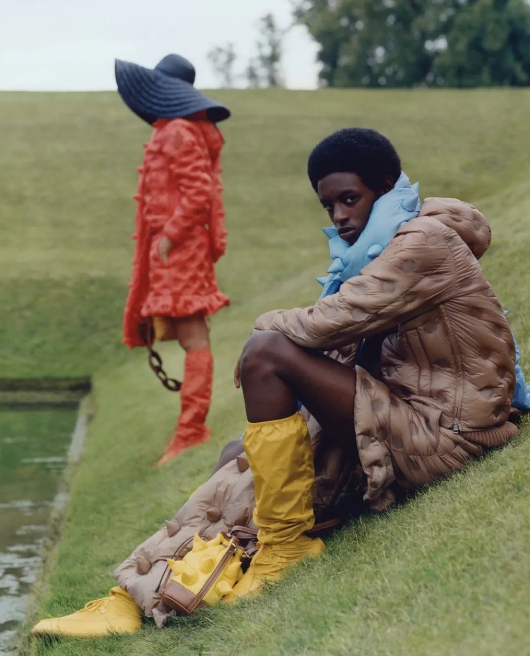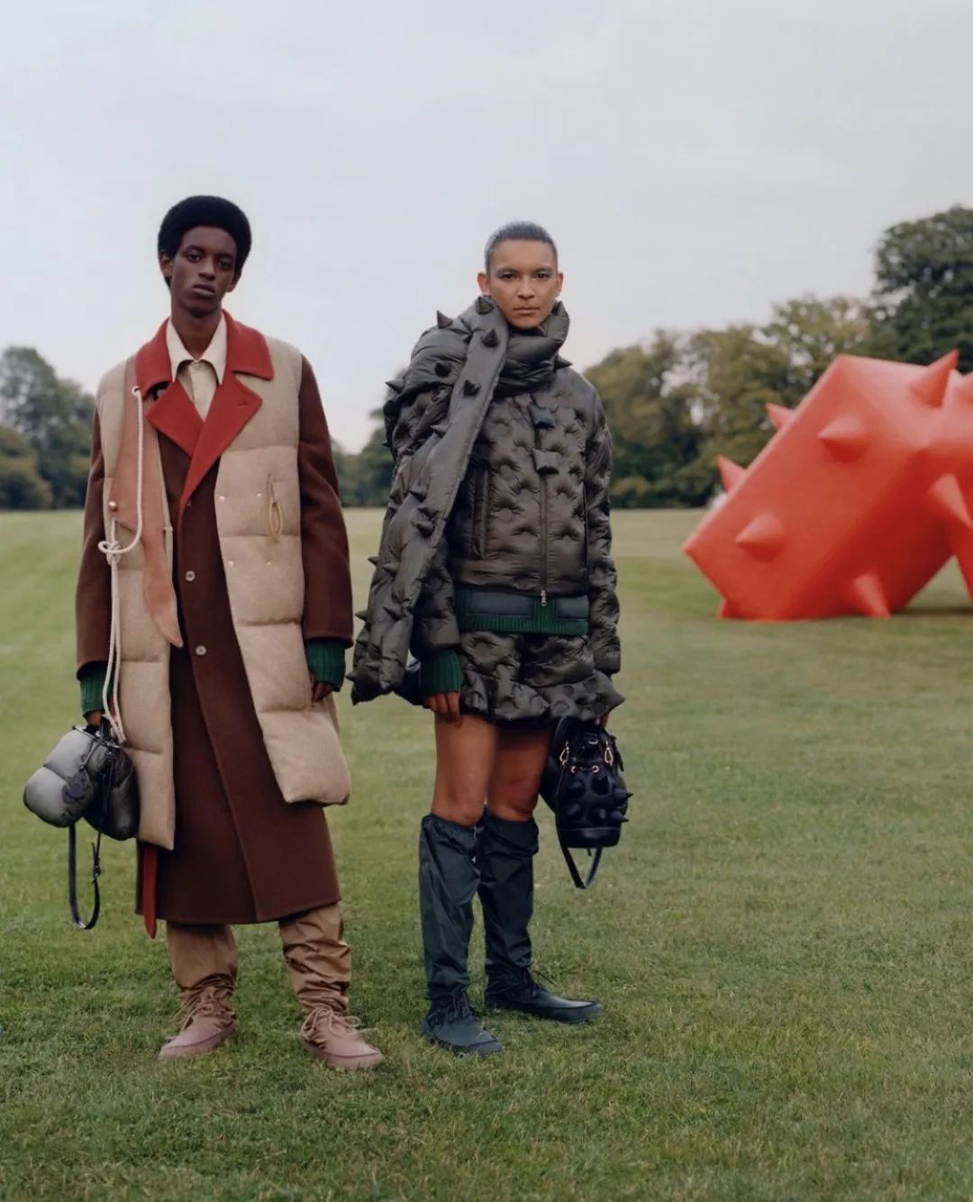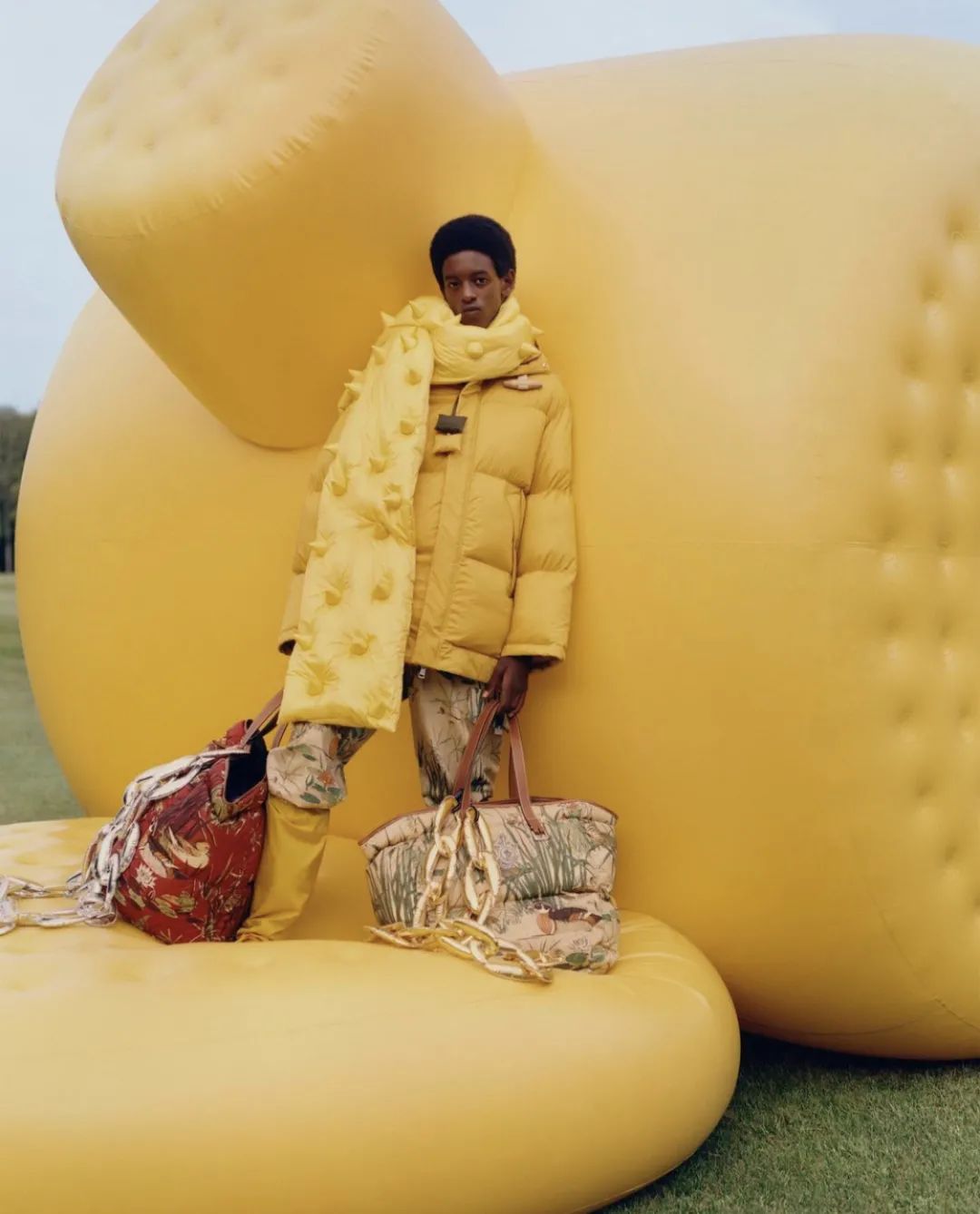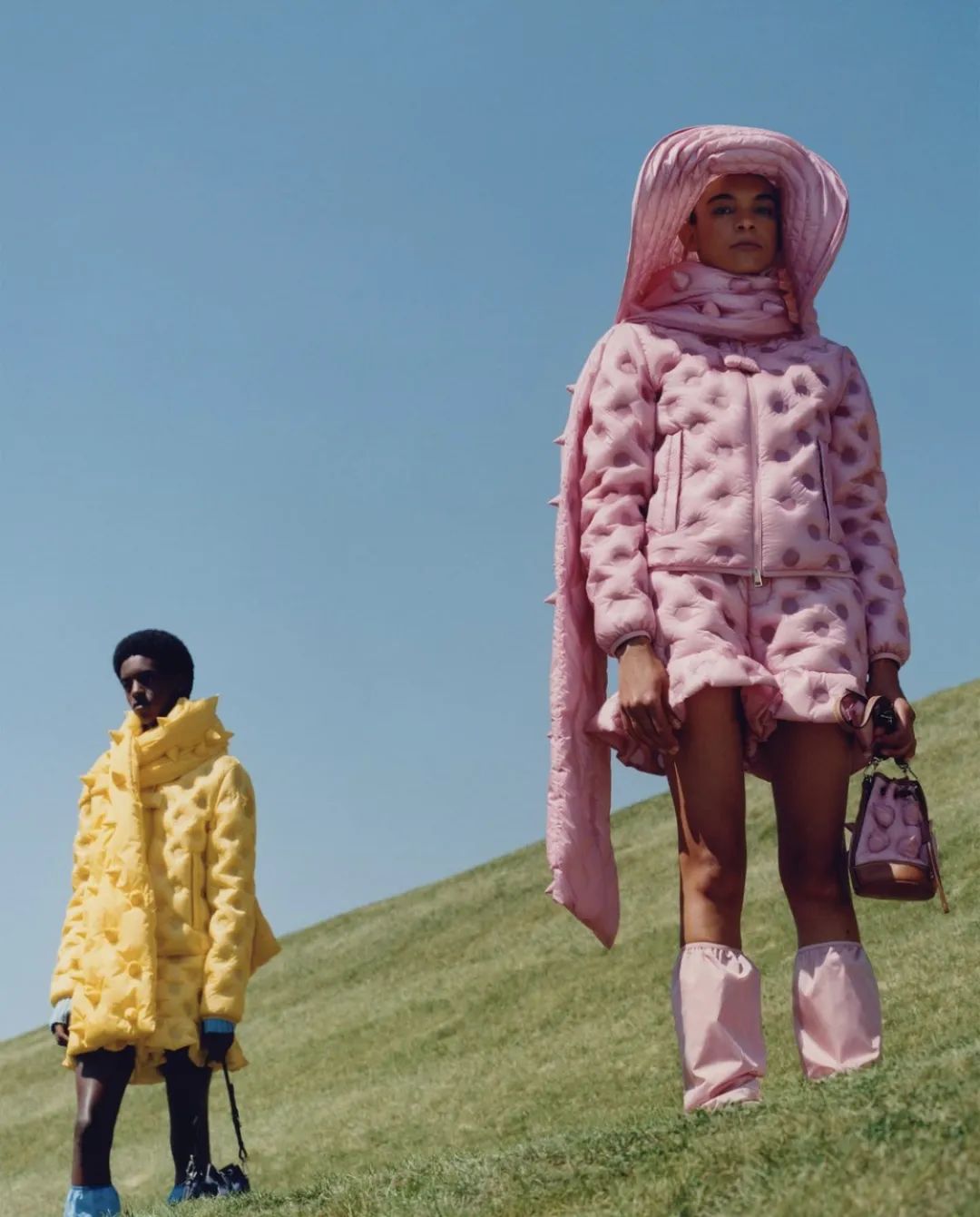 本次系列中,JW Anderson干脆改变了传统认知里羽绒服的常规绗缝法,而是采用了出现在沙发缝制中的等距圆点的固定方法来防止跑绒的问题。
