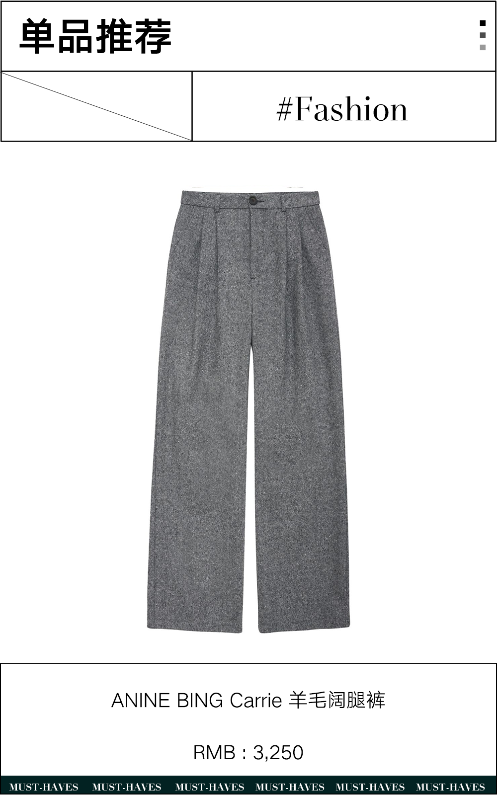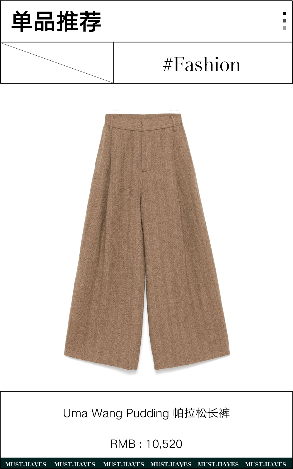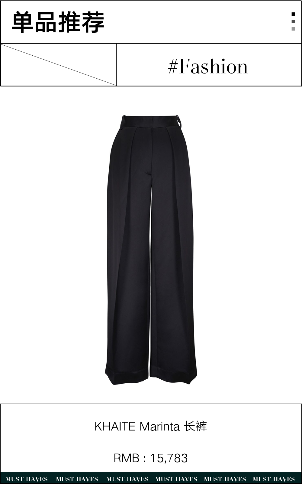 设计上也不需要太过“花样百出”,简单百搭的色调结合流畅利落的线条,至多在腰部来几个褶皱,对于小个子身材相对更加友好。在不断更迭的时装历史中,阔腿裤也曾被认为不够凸显女性魅力,也曾在流行趋势的不断变化中“失去光环”。但在注重自我体验的当下,它所带来的舒展时髦,恰恰也给我们带来了一份从容。最近“不讨好感”的概念再次被讨论,阔腿裤也是一件不用为了讨好完美身材而存在的单品。不为了讨好而内耗,穿搭如此,生活也是如此——选择让你舒适的、喜爱的,并尽情享受大步朝前走的痛快。这里有一些阔腿裤的单品推荐👖: