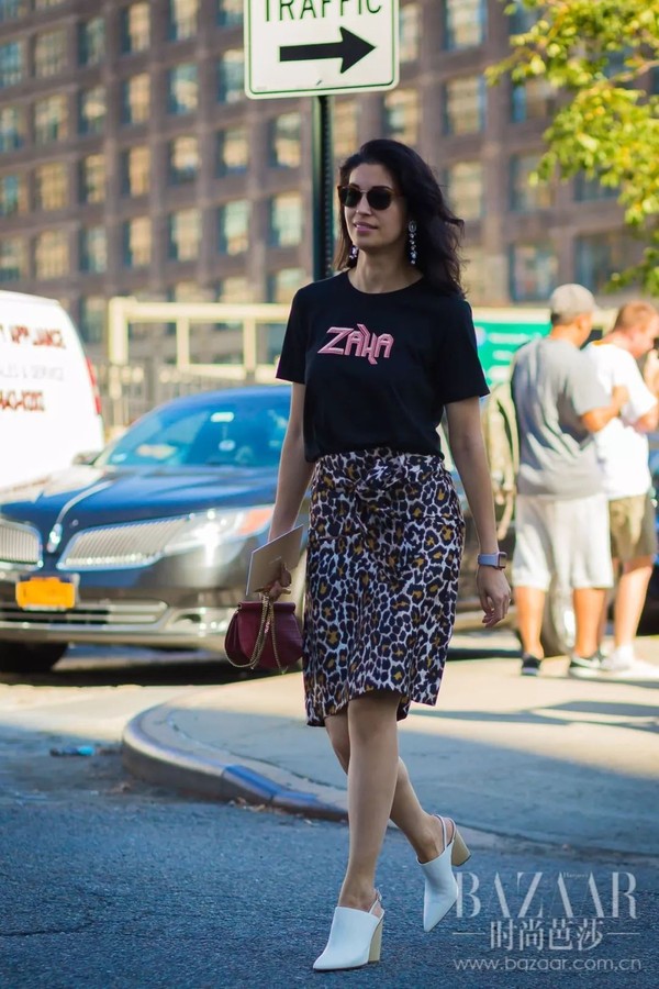 搭配裙子穿也是同理,宽松的上半身黑T一定和腰部有收紧作用的裙子一起穿,微胖的女士还可以把T恤扯成单肩穿,能起到瘦3斤的效果。