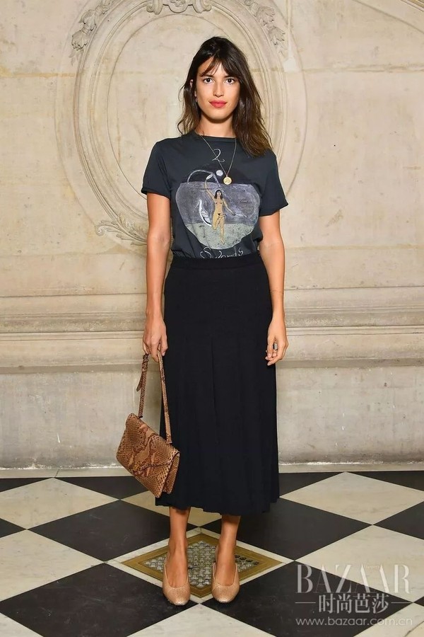 如果你的小腿纤细,那就更好啦,选择贴身款黑色T恤可以突出上半身的挺拔,搭配上露出小腿的中裙,你所谓的赘肉根本不存在。